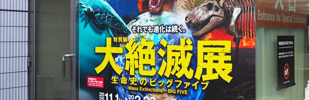 Aun así, la evolución continúa. La exposición especial "Extinción Masiva - Los Cinco Grandes de la Historia de la Vida" se celebra actualmente en el Museo Nacional de Naturaleza y Ciencia en Ueno. Es una exposición muy grandiosa que traza la trayectoria de la evolución conectada al superar la extinción, centrándose en las cinco extinciones masivas (Los Cinco Grandes) que ocurrieron durante los 4 mil millones de años de historia de la vida.